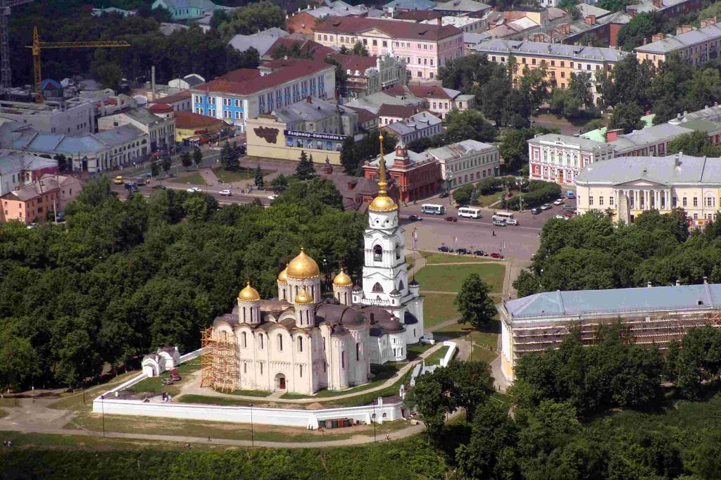 弗拉基米爾.斯維亞托斯拉沃維奇(弗拉基米爾.克拉斯諾耶.索爾內什科)公爵990或992年在古村鎮的地方建立了城市,隨著這個城市的居民接受洗禮,它首次被截入史冊。本市古城建筑莊重宏偉、規整勻稱且線條優美,城門分別以“金”、“銀”、“銅”命名。金門是罕見的軍事建筑典型,至今保留完好。市區內最古老的建筑,首推于1160年所建的。圣母升天大教堂(1185-1189年改建),也是俄羅斯現存最古老的教堂。此教堂由安德烈大公所建,以12世紀本地流行的“無色人工寶石建筑結構”而聞名,在12到15世紀期間,所有沙皇都在此進行加冕。13世紀時,教堂因韃靼入侵而遭到嚴重破壞。后來教堂經過修復,現仍保存了12、15、18世紀留下的彩色壁畫,其中又以15世紀畫作的收藏最為豐富。圣畫家安德列·魯布洛夫的名作“圣母圣像”,也從莫斯科移來此處珍藏。教堂內還有文化中心、圖書館等。