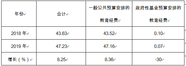 (一)2019年全市國家財政性教育經費(主要包括一般公共預算安排的教育經費、政府性基金預算安排的教育經費等)47.23億元,比上年增加3.6億元,增長8.25%。其中,一般公共預算安排教育經費47.16億元,占99.85%;政府性基金等預算安排的教育經費0.07億元,占0.15%(詳見下表)。