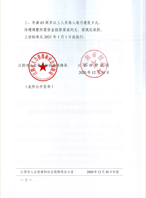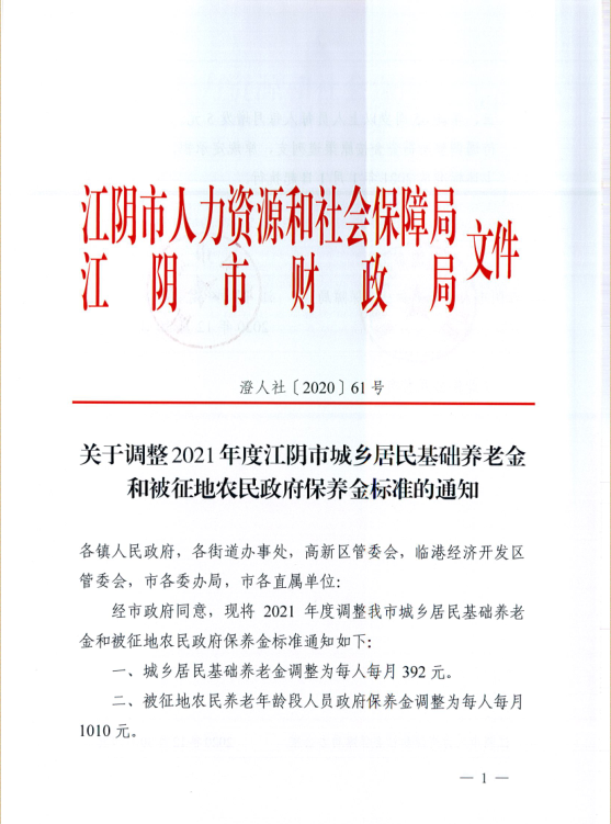 《關于調整2021年度江陰市城鄉居民基礎養老金和被征地農民政府保養金標準的通知》