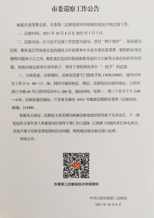 市委第三巡察組將在市財政局工作三個月左右。巡察期間(2021年10月8日-2022年1月7日),巡察組設置專門值班手機13656150003,接聽時間為工作日早9時至晚5時,同時可接收短信、微信。巡察組信訪接待時間及地址:每周一、周三工作日下午2:00-4:30,江陰市澄江中路60號江陰市綜治中心206室;通信地址:江蘇省無錫市A914號郵政信箱轉市委第三巡察組收,郵編:214400。