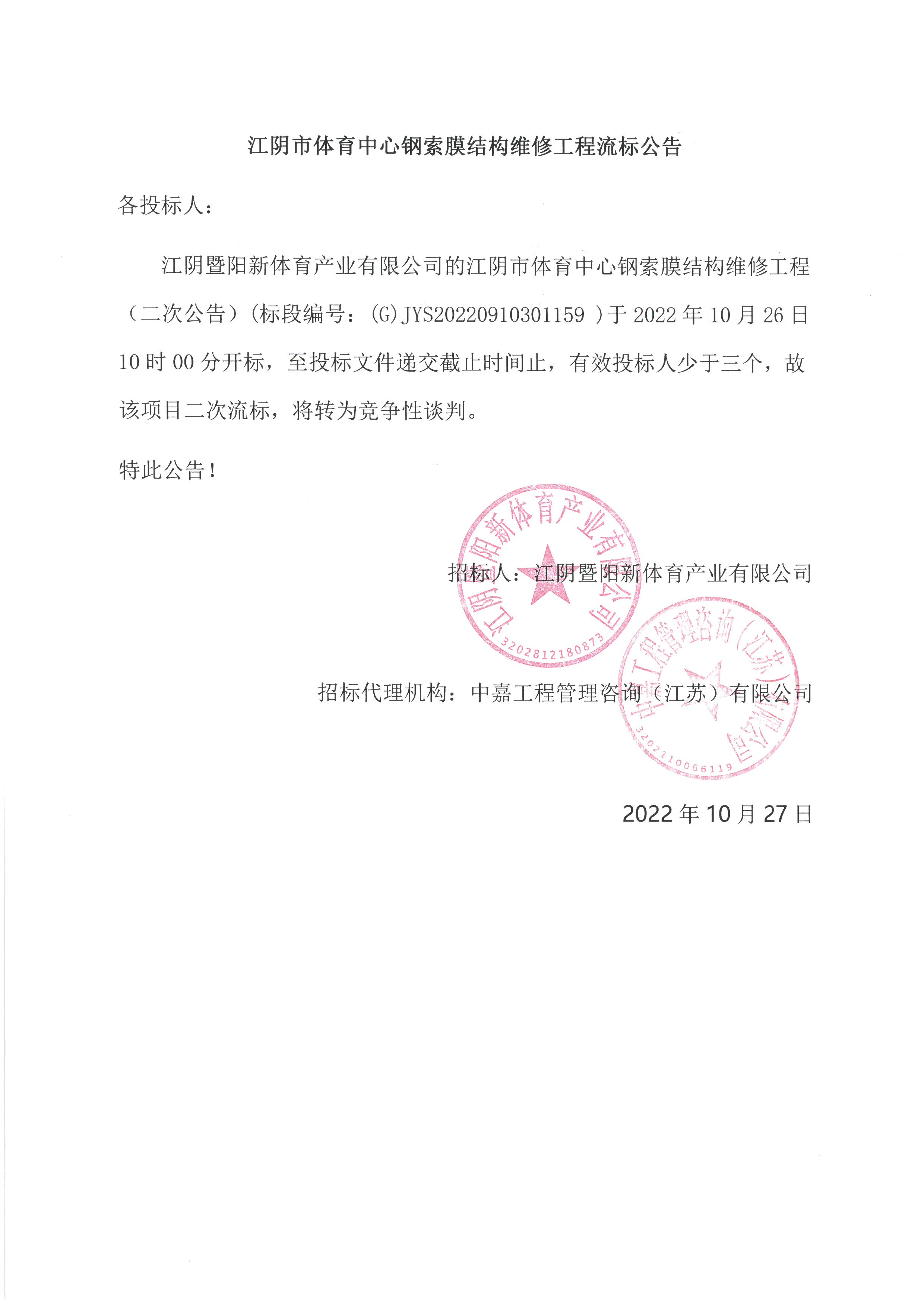 江陰暨陽新體育產業有限公司的江陰市體育中心鋼索膜結構維修工程(二次公告)(標段編號:(G)JYS20220910301159 )于2022年10月26日10時00分開標,至投標文件遞交截止時間止,有效投標人少于三個,故該項目二次流標,將轉為競爭性談判。