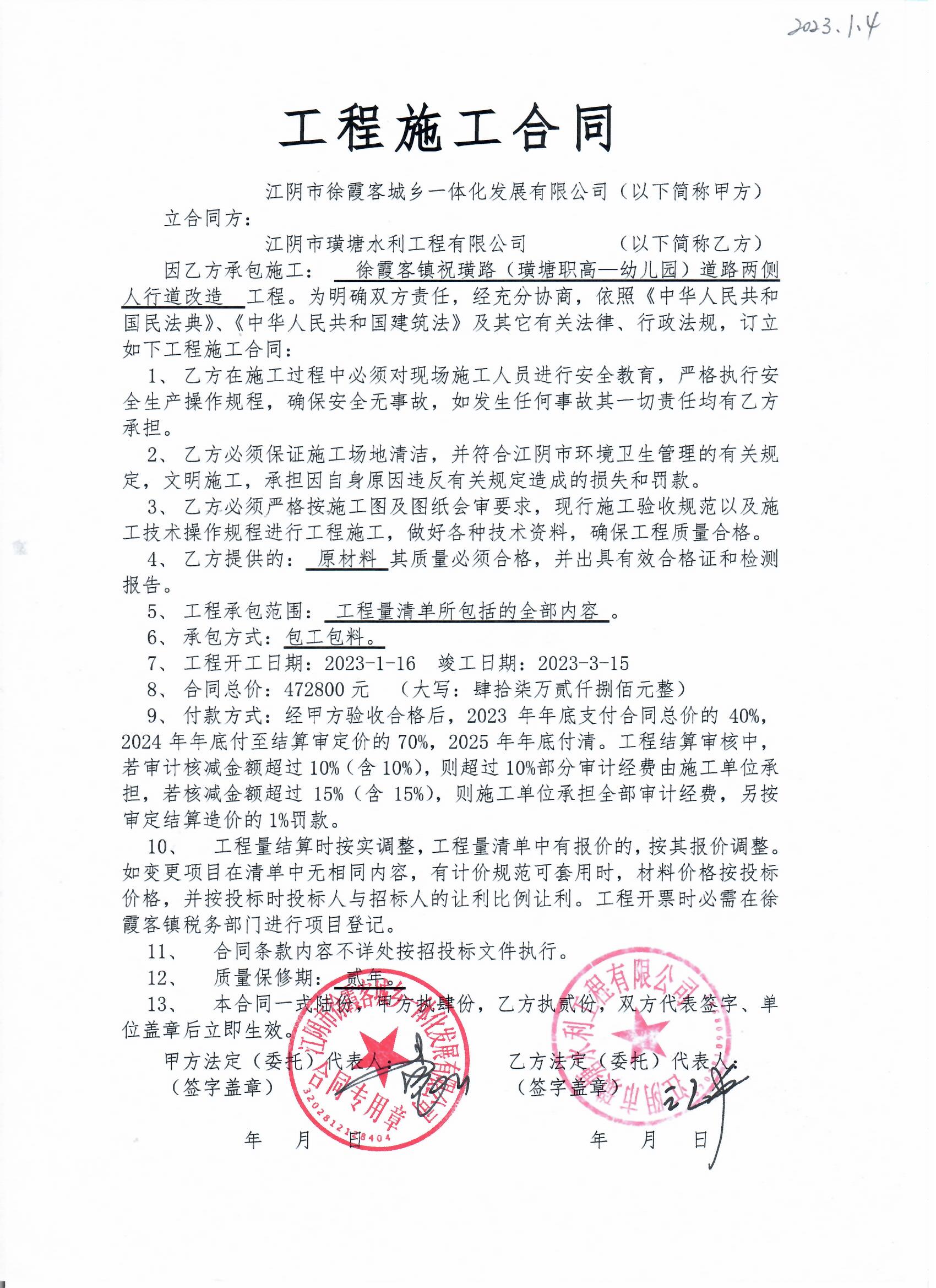 徐霞客鎮祝璜路道路兩側人行道改進工程施工合同 |
