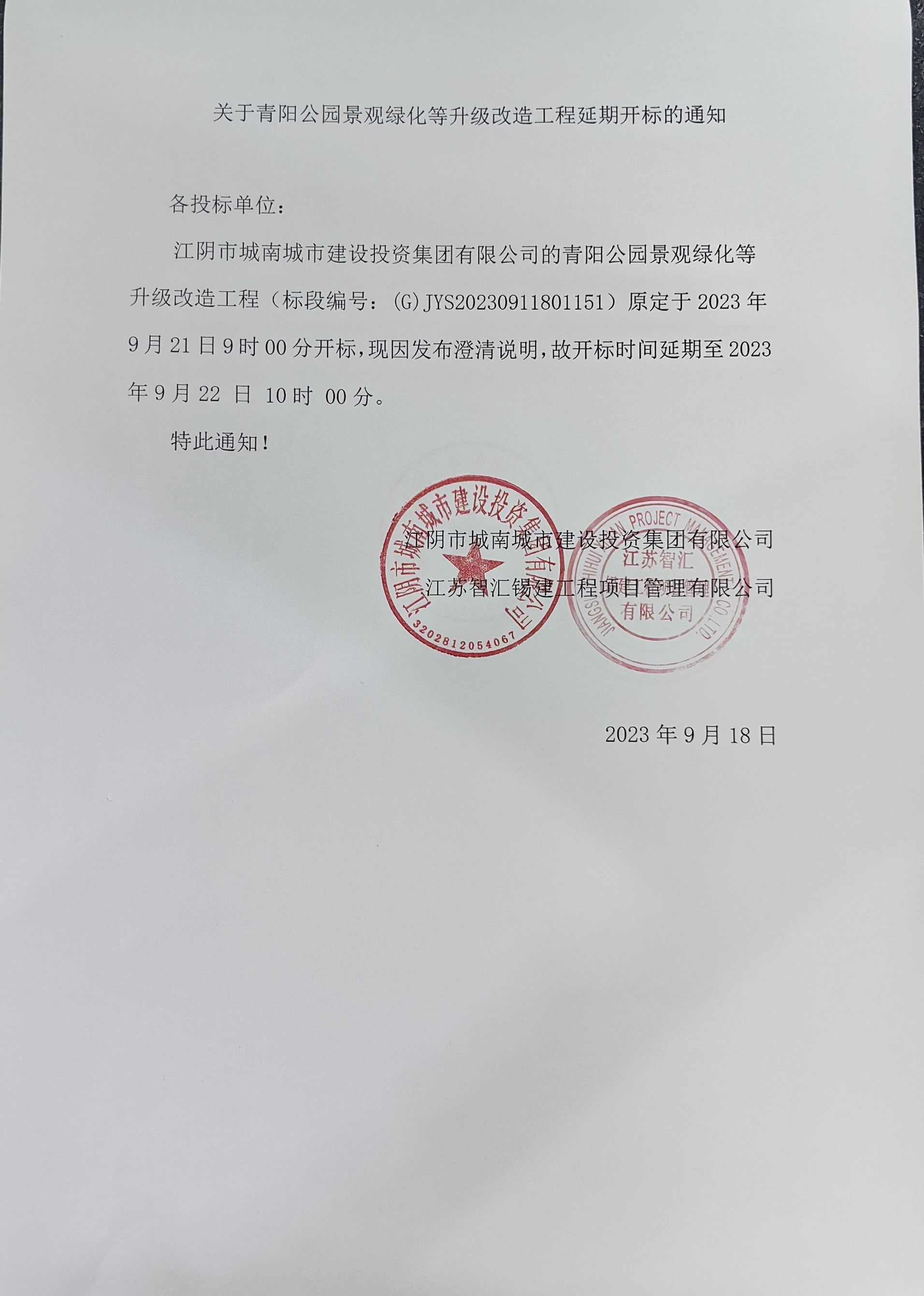 江陰市城南城市建設投資集團有限公司的青陽公園景觀綠化等升級改造工程(標段編號:(G)JYS20230911801151)原定于2023年9月21日9時00分開標,現因發布澄清說明,故開標時間延期至2023年9月22 日 10時 00分。