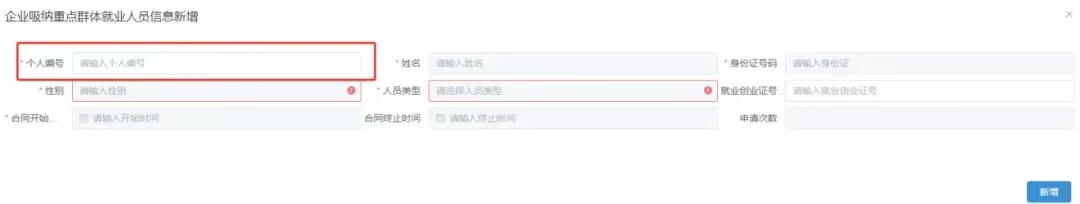 請注意紅色字體:如果單位有符合條件的登記失業滿半年以上的人員,在下面的列表里面會自動查詢出來,如果是需要驗證是否是建檔立卡貧困人口,就點擊右邊的新增按鈕,然后就會看到下面的模塊彈出。