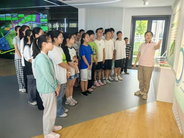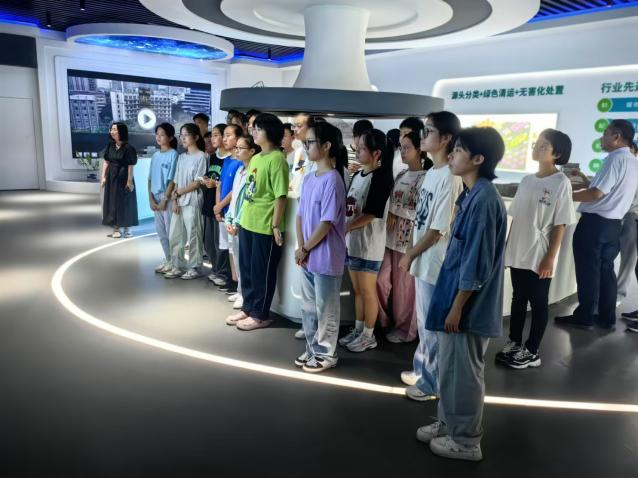 師生團首先來到江陰市錦繡江南環境發展有限公司。在工作人員的帶領下,師生團參觀了江陰市環保集團有限公司展示館。展示館內,同學們認真觀看企業宣傳片,深入了解環保集團發展歷程、發展理念以及未來規劃,并就環保知識進行互動交流。