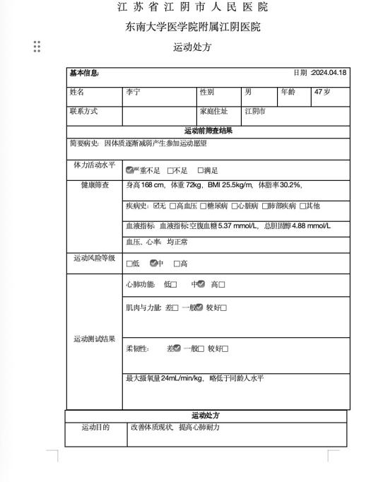 我局依托江陰市人民醫院、江陰市體育中心,為參與運動損傷治療、糖前篩查、慢病防治、體質監測的市民提供個性化的運動處方。這些運動處方根據市民的體質狀況和健康狀況,量身定制了科學的鍛煉方法和飲食建議。例如,針對心肺功能較差的市民,處方中可能會建議進行有氧運動,如快走、慢跑等;針對肌力水平較低的市民,處方中可能會建議進行力量訓練,如舉重、俯臥撐等。通過遵循這些運動處方,市民可以更好地調整自己的飲食結構和鍛煉方式,從而提高健康水平。