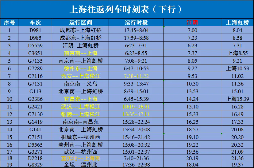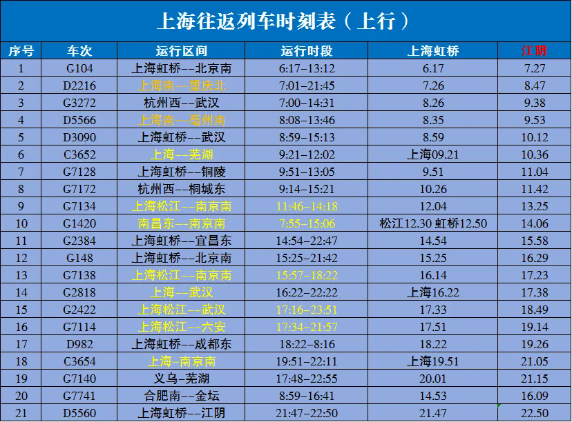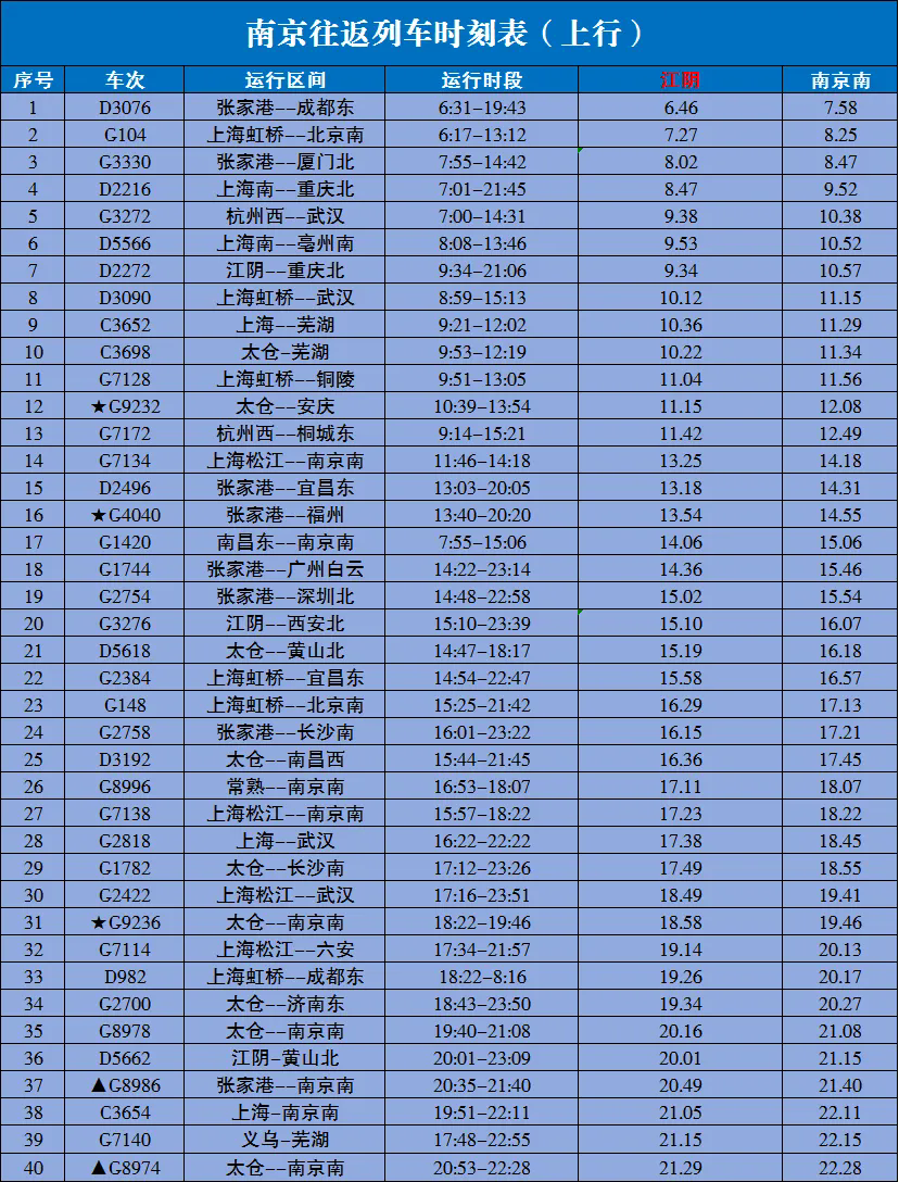 在強化通勤服務方面,新增G3330、G3332次廈門北至江陰(張家港)列車,精準匹配早高峰通勤需求——江陰、張家港旅客可乘此列車在早間高峰時段準時抵達南京南站,同時車次在晚上8點后從南京南返程,形成雙向通勤閉環。新增的D5559、D5560次江陰至上海虹橋列車,發車時刻設計更顯貼心:清晨6:23江陰開行,7:31抵達上海虹橋,晚間21:47從上海虹橋返程,一舉填補早8點前與晚9點后往返上海的通勤車次空白,為沿線居民搭建起更靈活的城際往來橋梁。