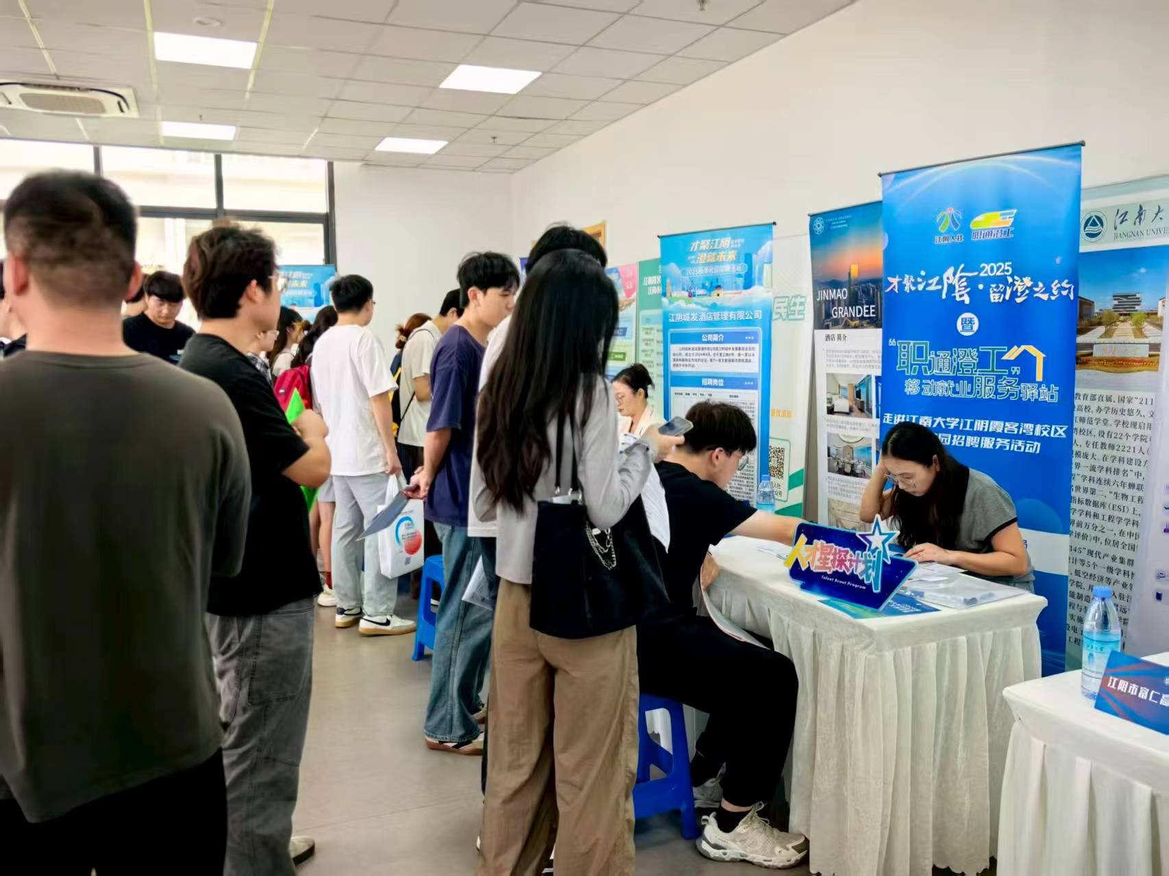 學子手持精心準備的簡歷穿梭展位,細致咨詢崗位要求、職業發展路徑及福利待遇;企業招聘人員則耐心介紹發展前景與企業文化,不少展位前排起長隊,雙向的熱忱讓現場活力滿滿。此次活動成果豐碩:吸引江南大學幾百名學子參與,企業累計收到簡歷461份,初步達成就業意向近百人,充分體現江南大學學子對江陰企業的認可與期待。