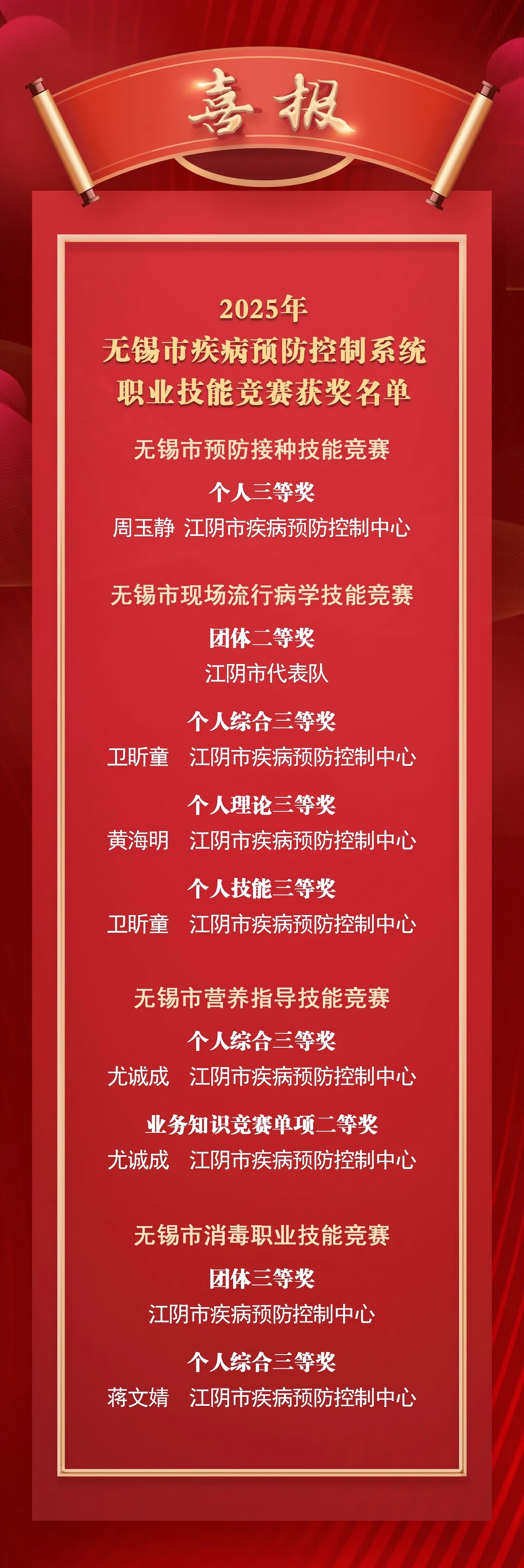 7-10月,在無錫市衛生健康委舉辦的2025年全市疾病預防控制系統職業技能競賽中,我市獲得多項團體及個人榮譽,展現了工作人員精湛的職業技能和良好的精神風貌。
